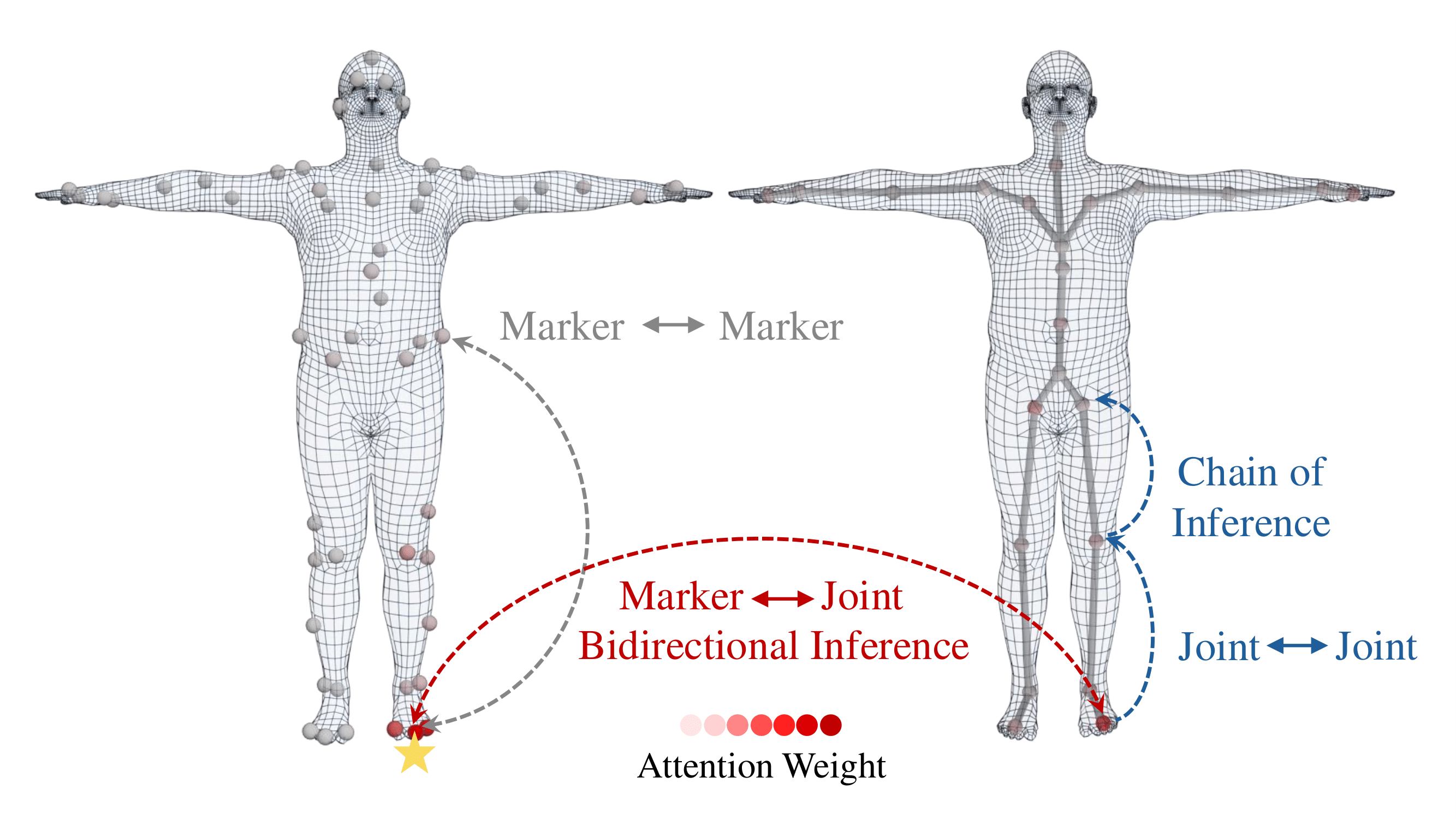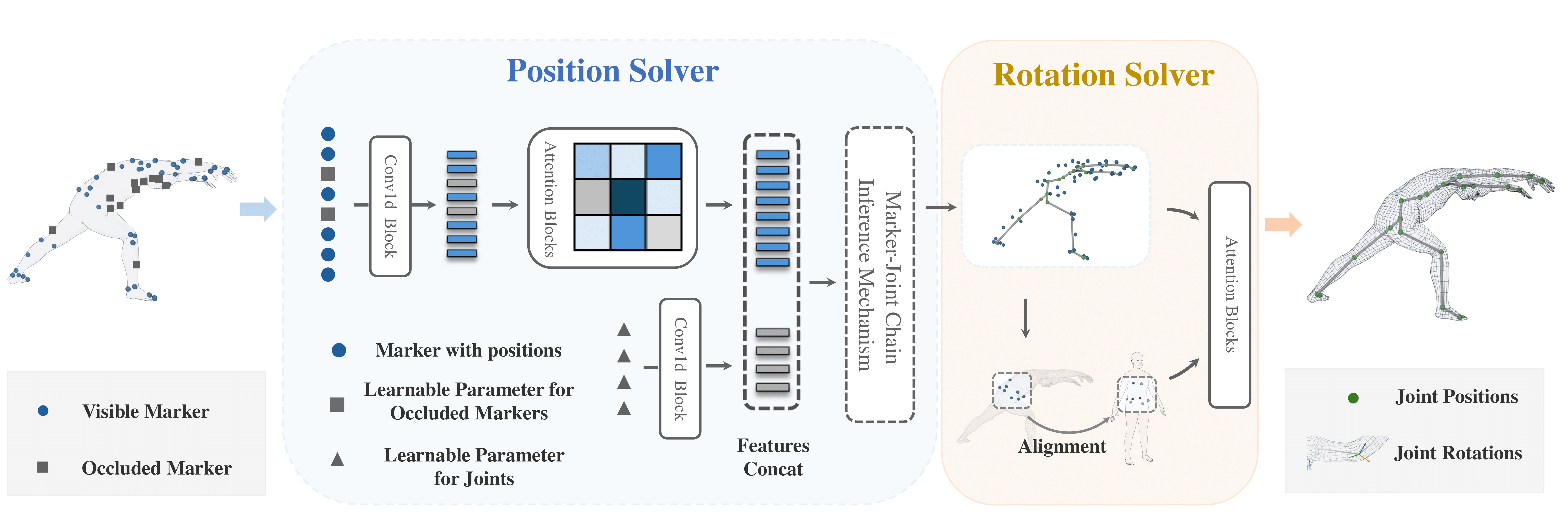 OpenMoCap is designed to handle real-world marker occlusions through a two-stage architecture. First, a Position Solver recovers the locations of both visible and occluded markers and estimates joint positions, powered by our Marker–Joint Chain Inference Mechanism that builds long-range dependencies between markers and joints. Then, a Rotation Solver takes the refined positions to predict joint rotations using a stacked attention-based model. Together, these components enable OpenMoCap to deliver accurate motion reconstruction even under severe occlusions.